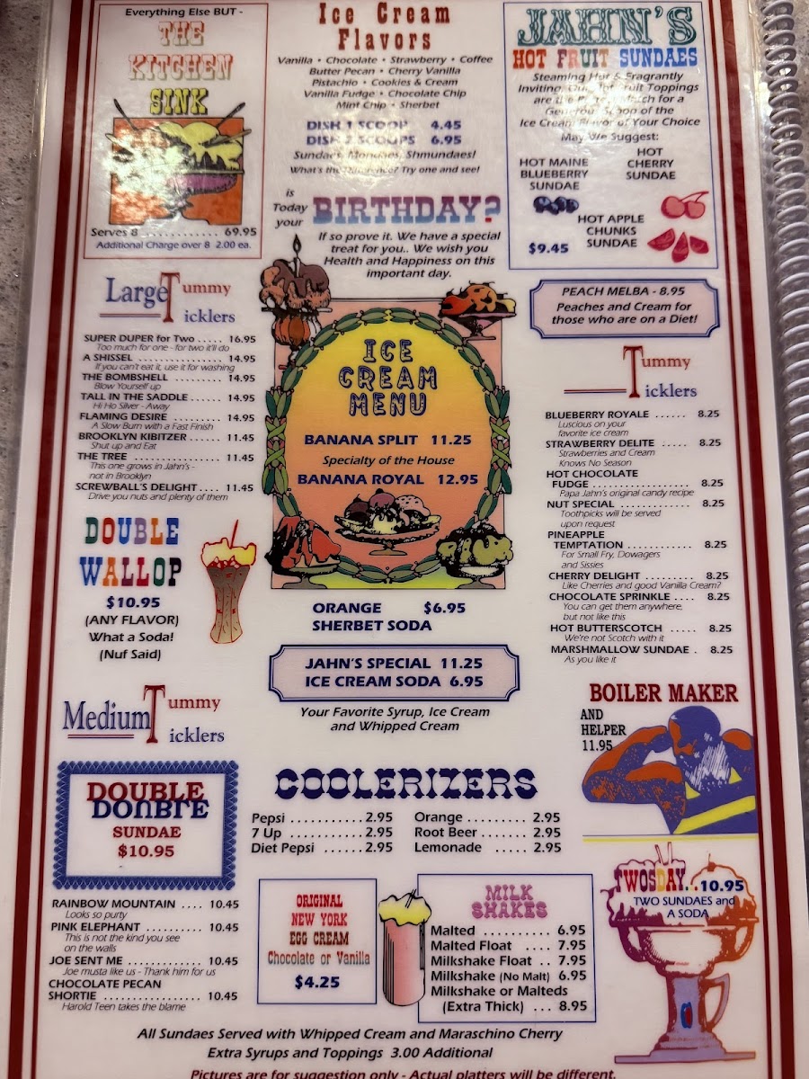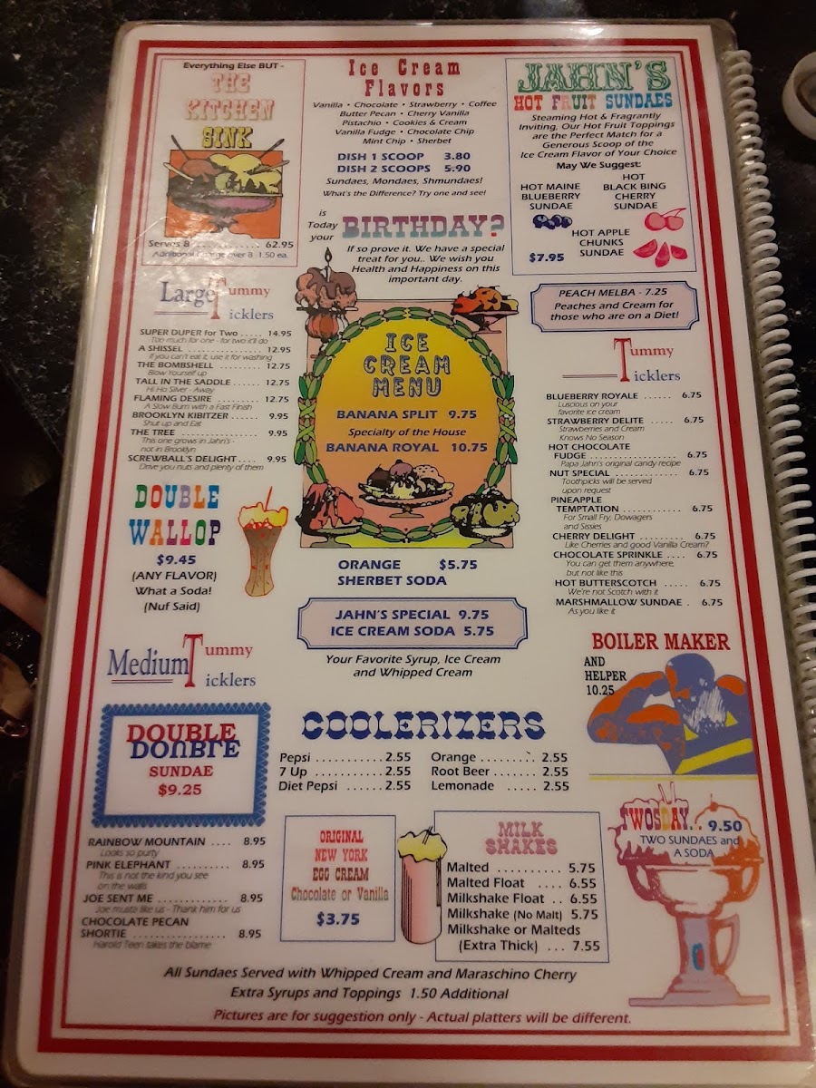 For those seeking lighter or health-conscious choices, the diet delights section offers fresh items like grilled chicken breast with cottage cheese and crisp salads. Sweet tooths will appreciate the nostalgic ice cream treats, from extra thick milkshakes and chocolate egg creams to hot fruit sundaes and mint chocolate chip ice cream, perfectly complementing the old-school ice cream parlor atmosphere that Jahn’s maintains.