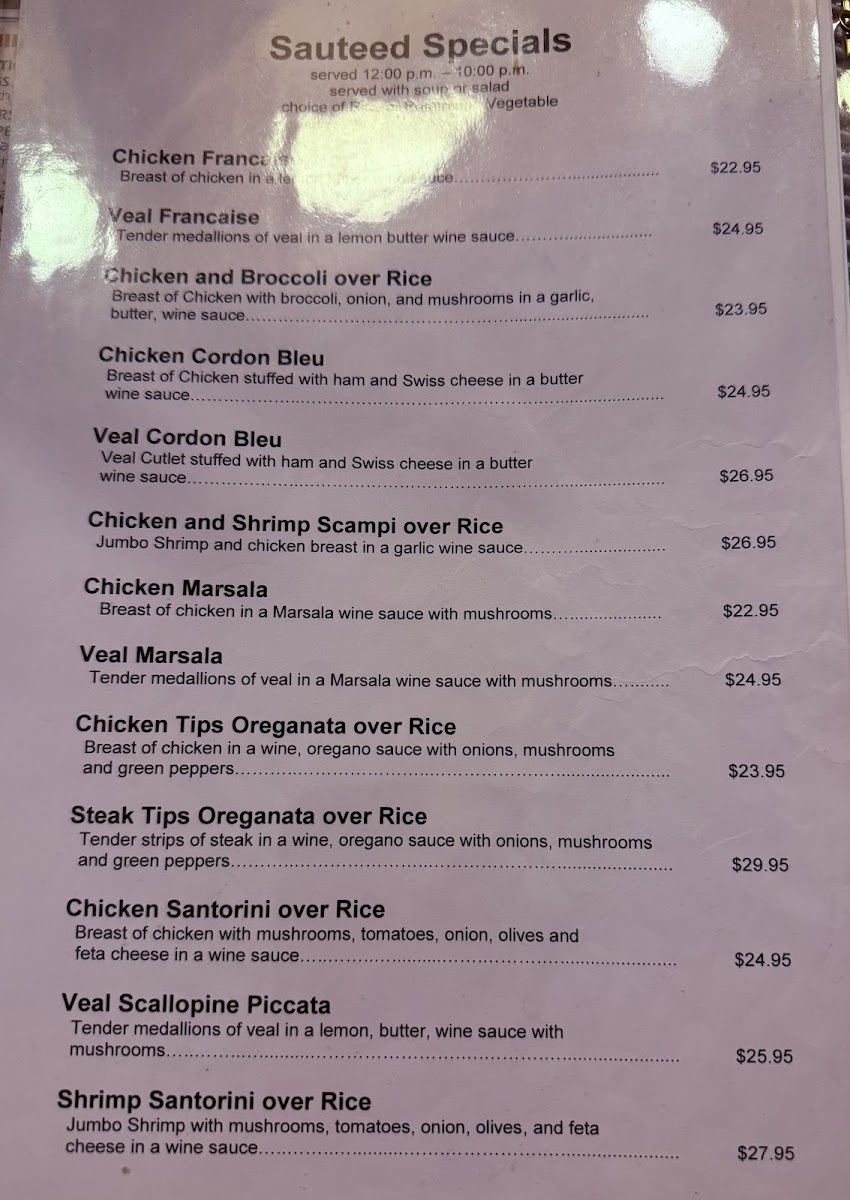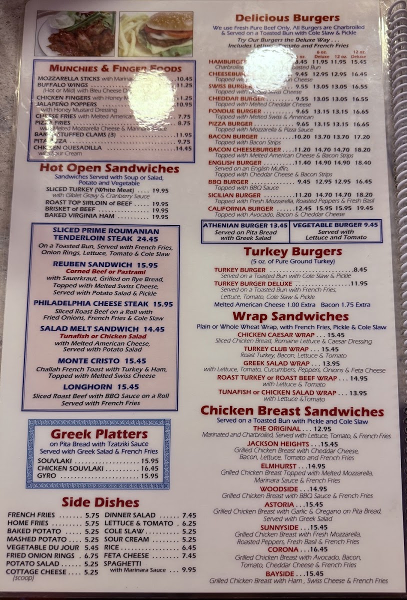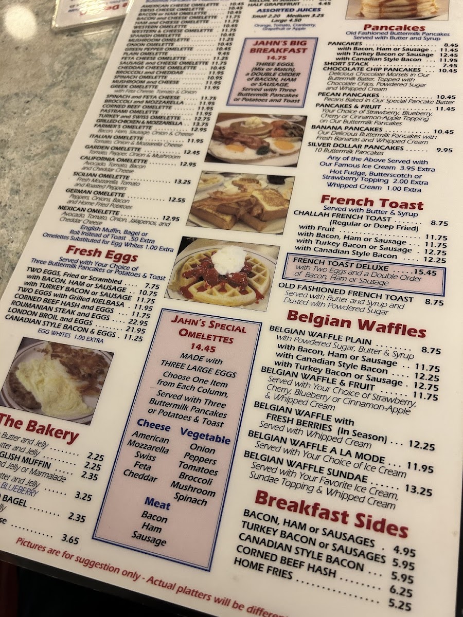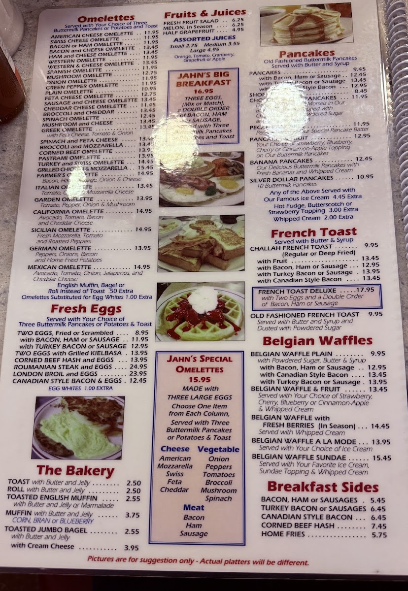Morning meals often feature traditional breakfast plates like the Jahn's Special Omelette, Silver Dollar Pancakes with bacon or sausage, and Challah French Toast topped with strawberries and whipped cream. For lunch and casual dinners, the menu balances classic sandwiches such as the Pastrami with eggs or a Chicken Salad Club, alongside more substantial options like the Philly Cheese Steak or Greek platters including Souvlaki and Gyros.